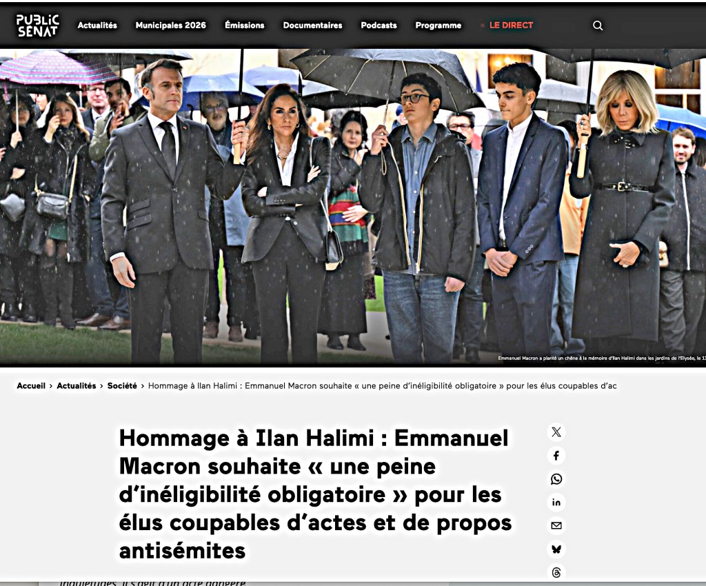 Le même jour Macron instrumentalise un hommage à Ilan Halimi, victime il y a vingt ans d’un crime crapuleux, pour annoncer son intention de rendre inéligibles les députés coupables d’actes et de propos « antisémites ». On sait ce que vaut cette tarte à la crème pour disqualifier ceux qui s’opposent au génocide des Palestiniens perpétré par Israel.